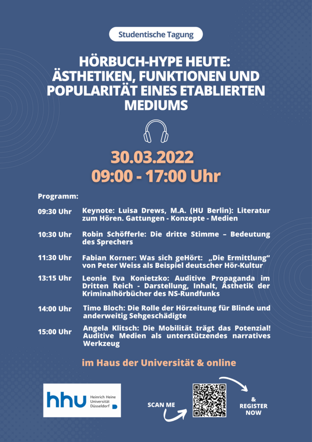 Bis zum nächsten Bahnumstieg eine epische Schlacht zwischen Zwergen und Elfen, Mörderjagd vor dem Einschlafen oder rasch beim Ausräumen der Spülmaschine etwas über das Weltall lernen: was zu Beginn der Geschichte des Hörbuchs noch unmöglich war, ist heute für eine Vielzahl von Hörer:innen Standard. Internet und Smartphone haben die Art der Rezeption von Hörbüchern verändert. War es in den 1950ern noch technisch aufwändig, eine Faust I Lesung auf eine Schallplatte zu speichern, kann jeder Text heute mit einfachen Mitteln vertont und über das Internet in Umlauf gebracht werden. Zunehmend hat sich ein spezifischer Hörbuchmarkt entwickelt, der eigene Communities anzieht, selbständige Formate und Themen besetzt und Lücken in der Rezeptionskapazität der Medienkonsument:innen schließt. Denn Hören boomt: 177 Minuten täglich verbrachten die Deutschen 2021 mit Hörinhalten, 19% der Hörer:innen ab 14 hören dabei gelegentlich bis häufig Hörbücher. Das Hörbuch ist vom Status eines Buchmarkt-Anhängsels in die Nähe von Podcasts und weiteren, zunehmend populären und nicht-linearen auditiven Medien gerückt und hat längst eigene ästhetische und funktionale Eigenheiten ausgebaut, denen wir auf der Tagung nachgehen wollen. Auf der Studierendentagung am Institut für Germanistik der Heinrich-Heine-Universität werden wir dieses spannende Medium sowie seine Ästhetiken und individuellen wie kollektiven Funktionen diskutieren.